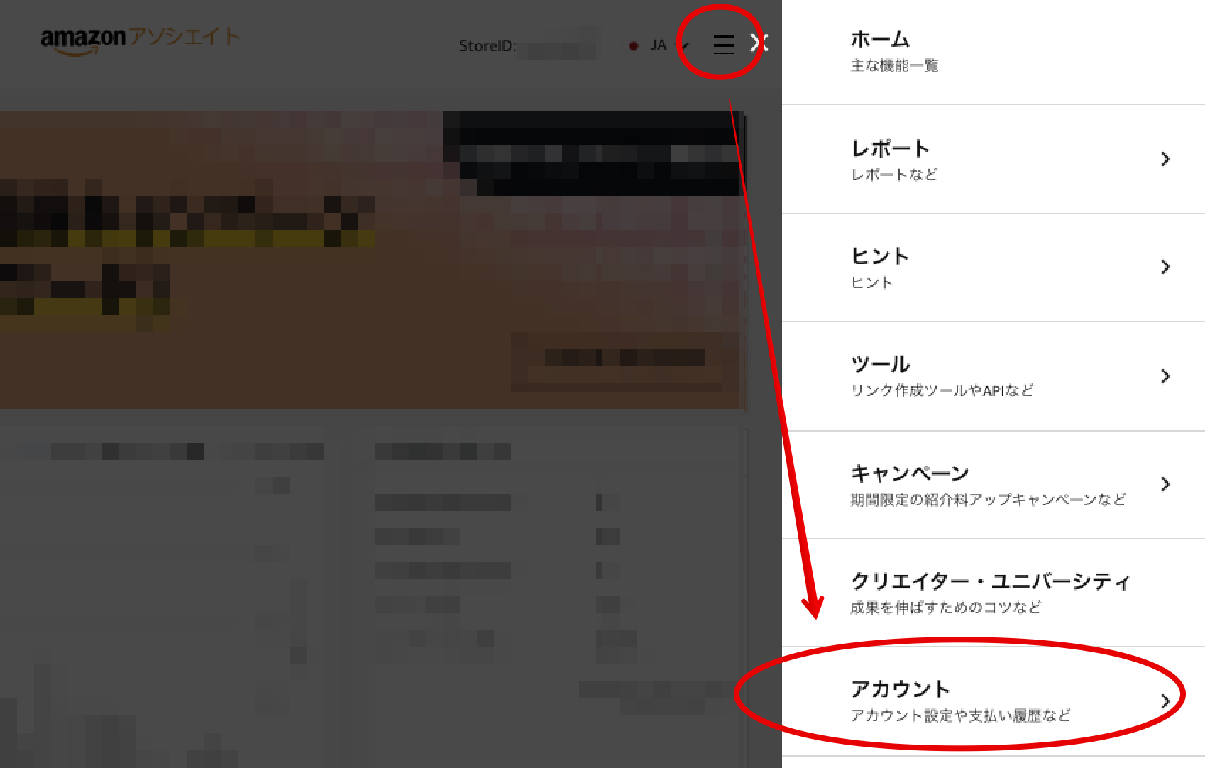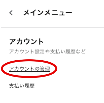 右上にある「三」をクリックし、「アカウント」をクリック