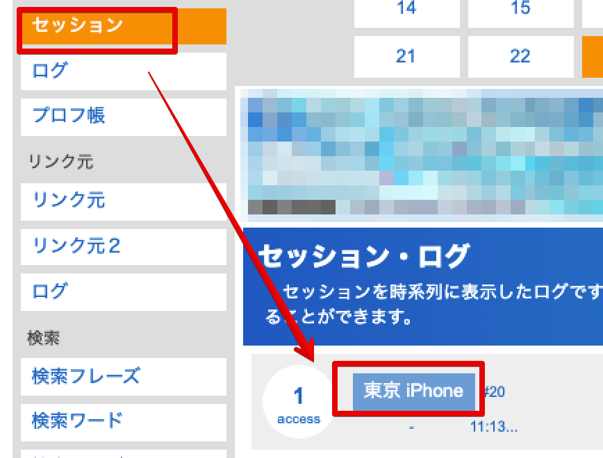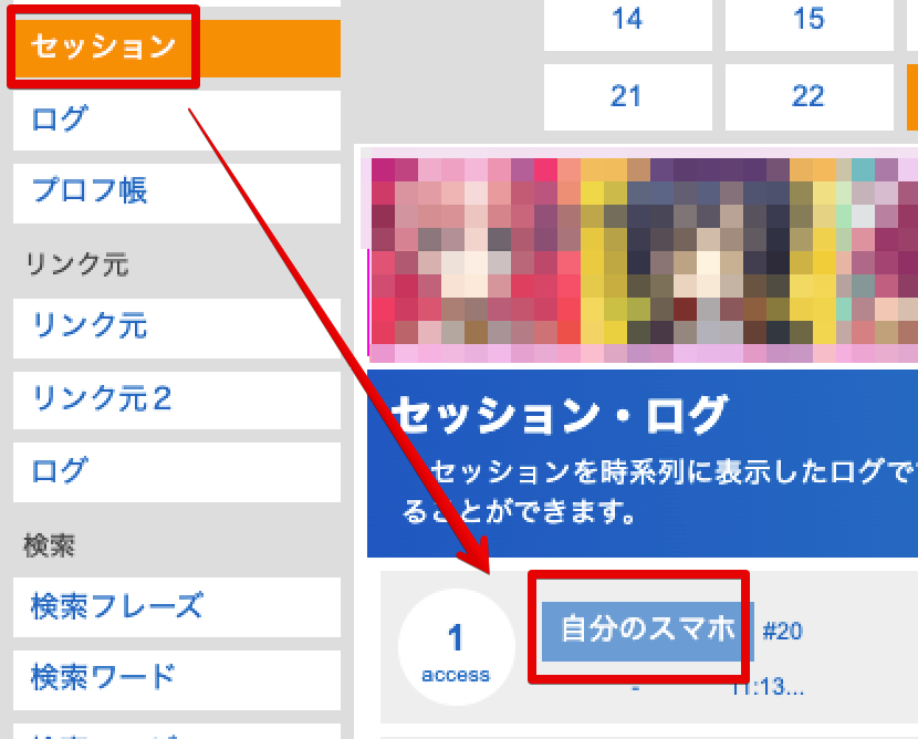 自分のブログにアクセスしてから、左サイドバーの「セッション」をクリックし、一番上にある表示をクリックします。