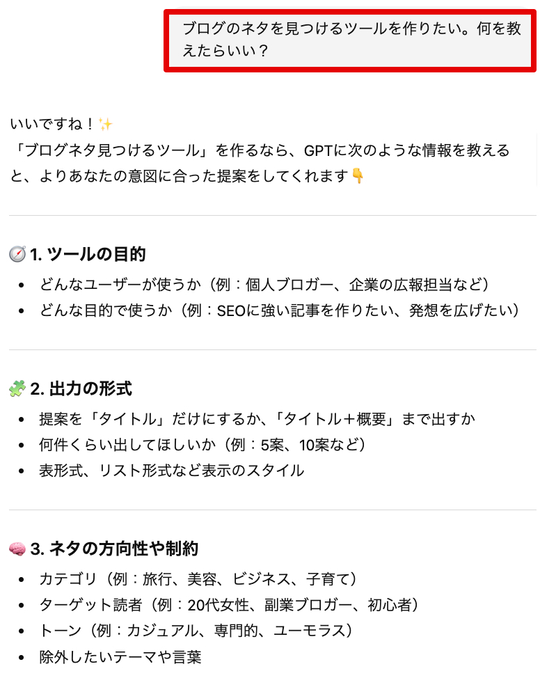 とたった1行相談するだけでも、オリジナルGPTsが作れる指示書(プロンプト文)や設定例をその場で提案してくれるんです。