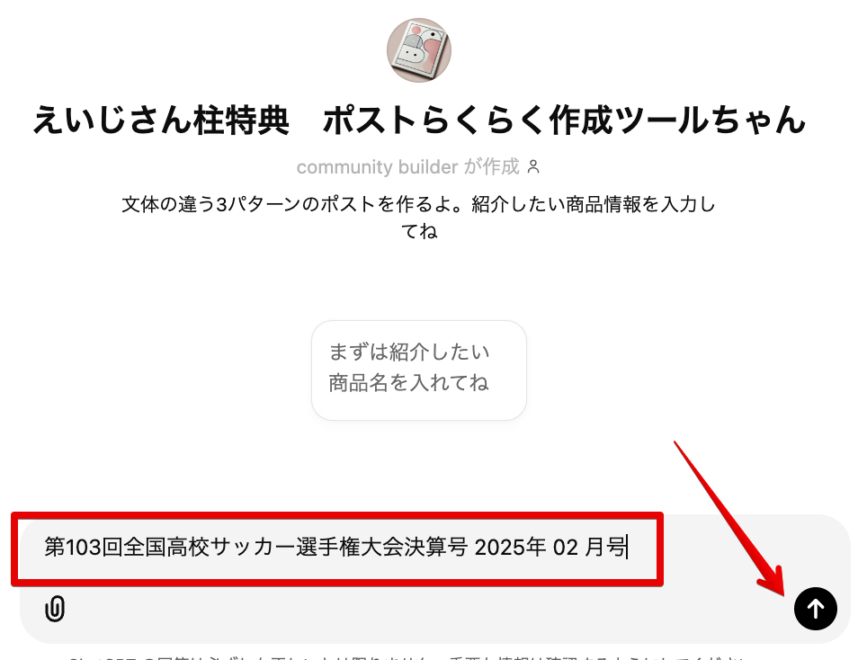 「サッカーで成約取っちゃうぞ君(GPTs)」では、サッカーの成約が取れるポストが、試合に出るチーム名を入れるだけでも作れます。