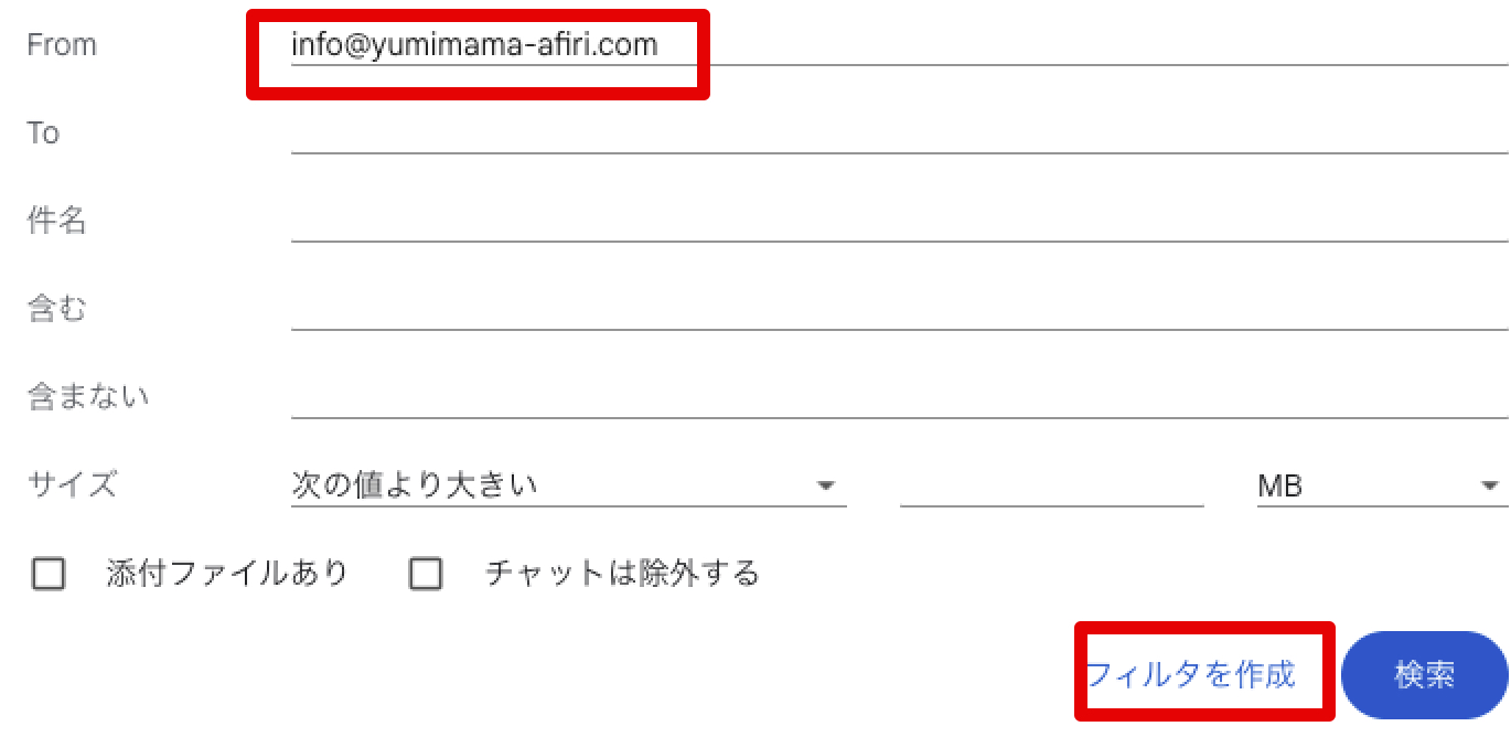 由美のメールアドレスがFromの欄に入っていることを確認して右下の「フィルタを作成」をクリック。