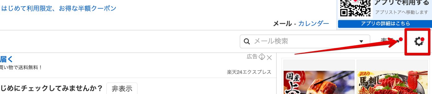 ブラウザでYahooメールを開き、ログインしたら、右上にある歯車マークをクリック