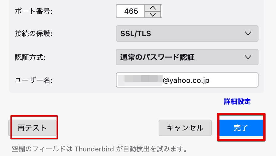 入力できたら左下の「再テスト」をクリックし、「完了」をクリック
