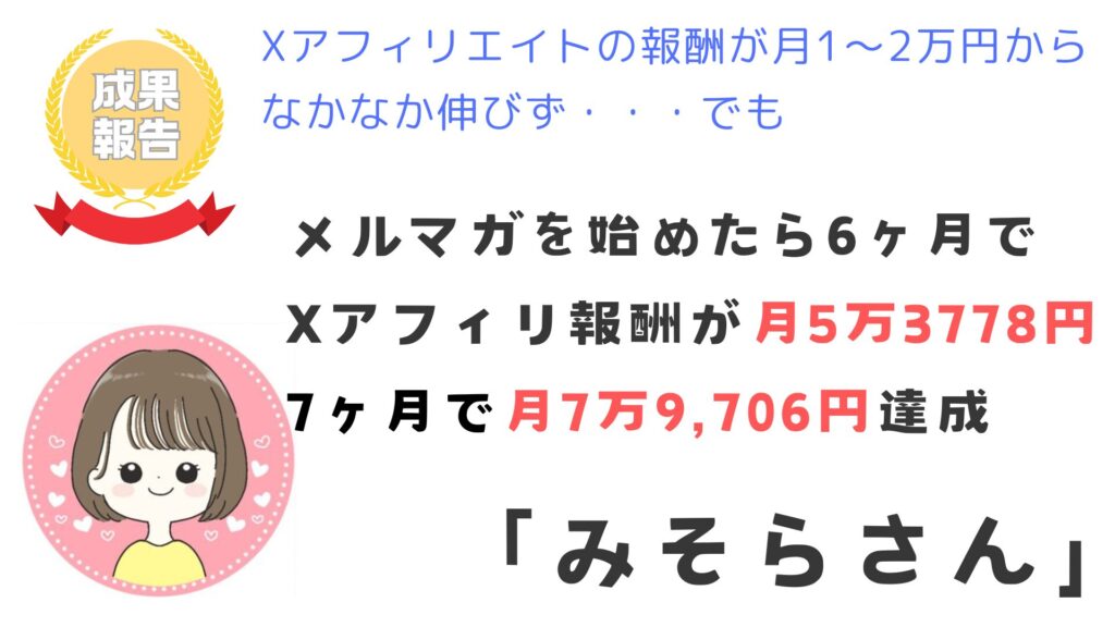 ◎Xアフィリエイト報酬459円のママ → メルマガ2ヶ月目で1万円以上の報酬発生、半年で33,873円達成!