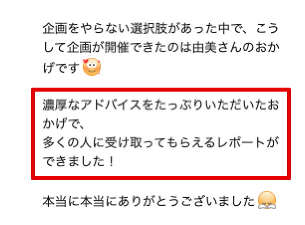 私がチェックしながら、プレゼントはこういう風に書いたほうが分かりやすい、もうちょっとここを追記したほうが良いなど、丁寧に詳しくアドバイスさせていただきます。