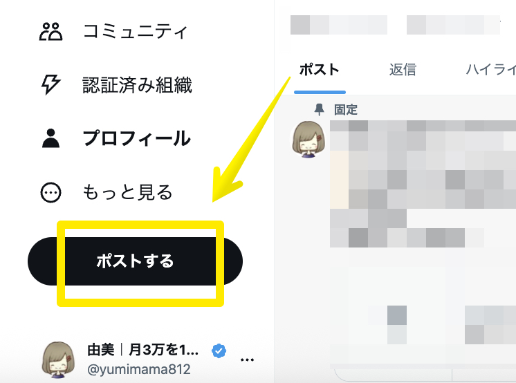 X(Twitter)の画面を開き、「ポストする」をクリック。